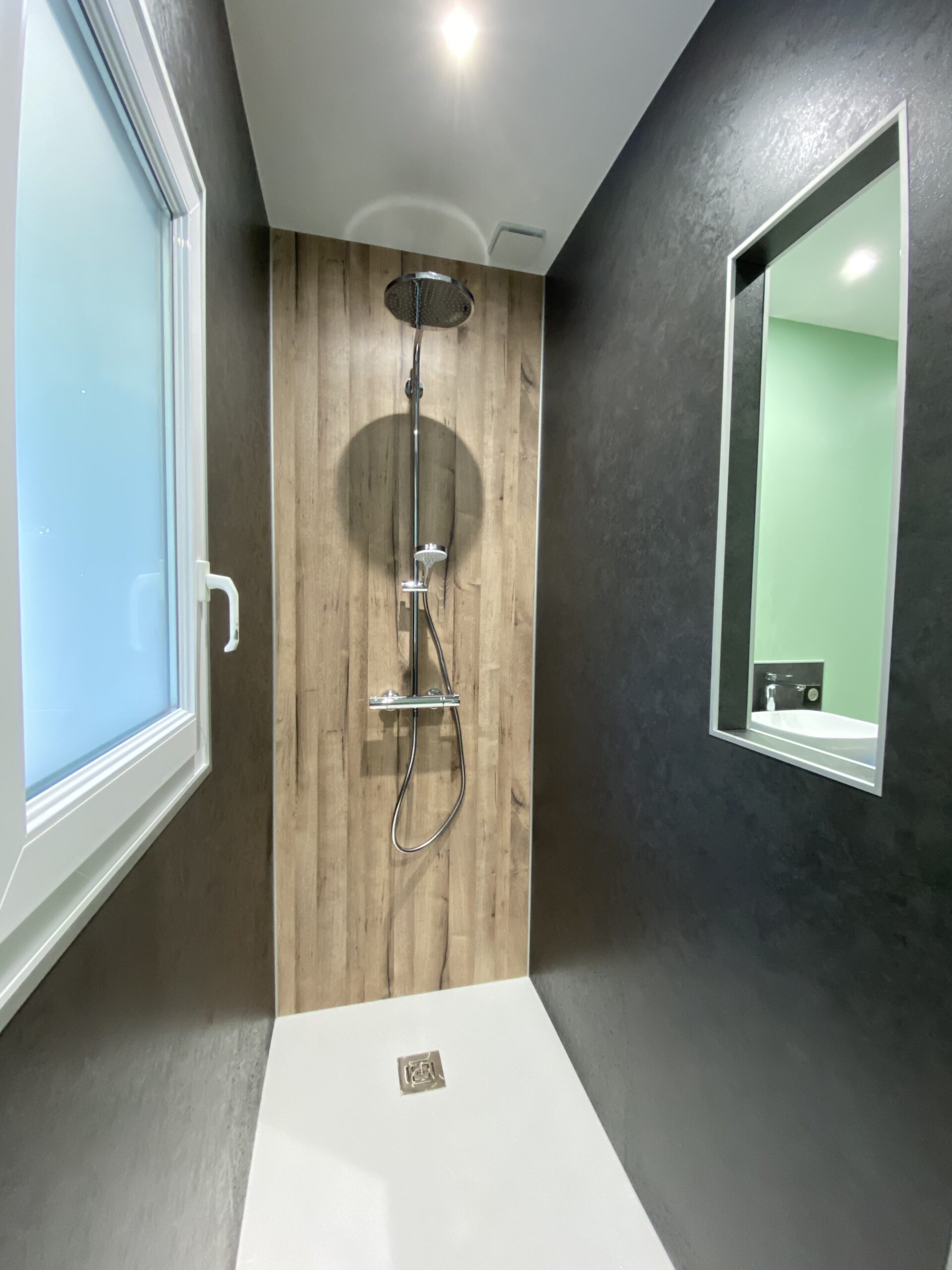 Les couleurs tendres du meuble viennent apporter un joli contraste avec les panneaux muraux Vipanel pierre noir. Le fond de douche bois apporte de la chaleur et une jolie harmonie dans la pièce.