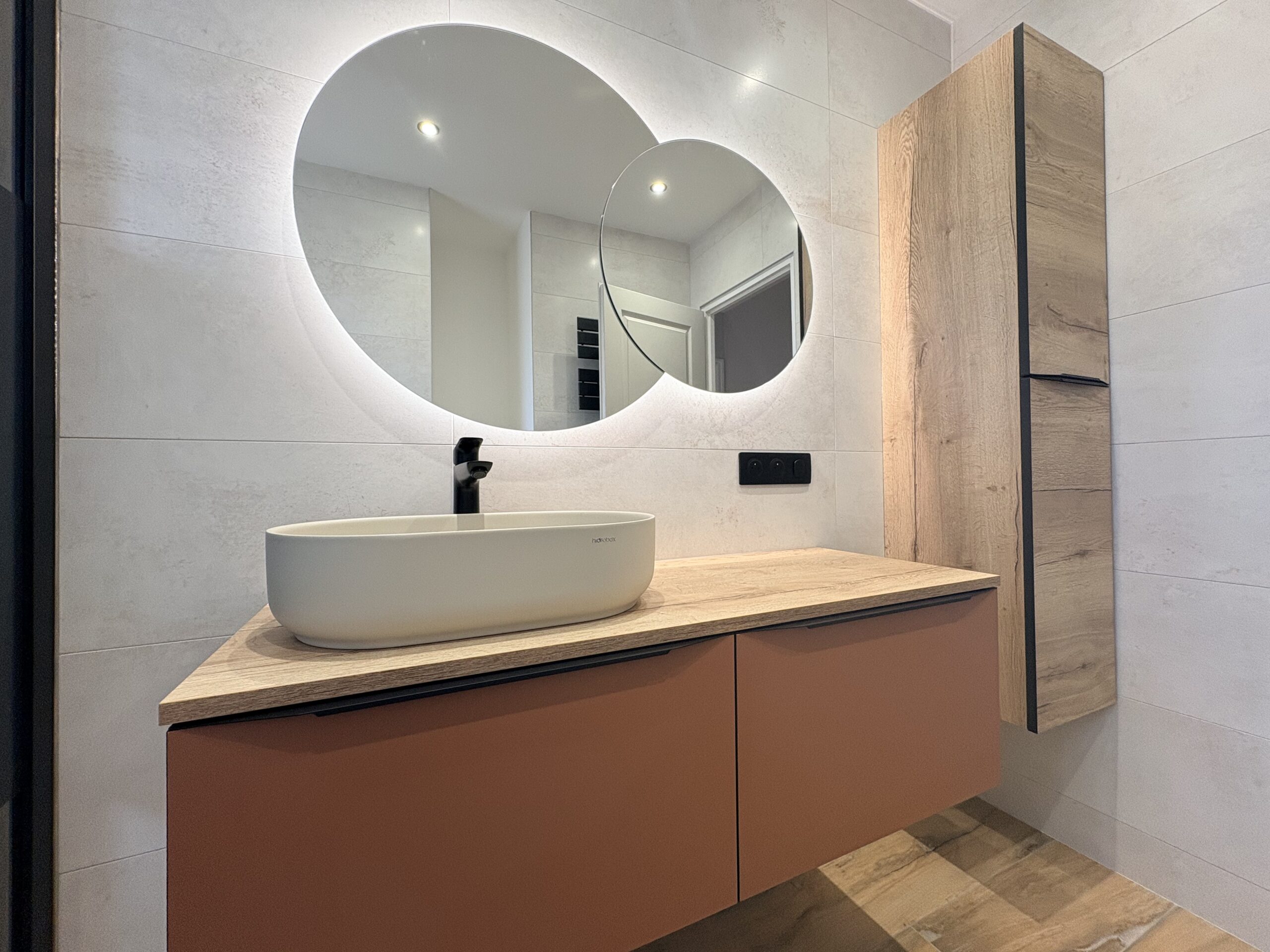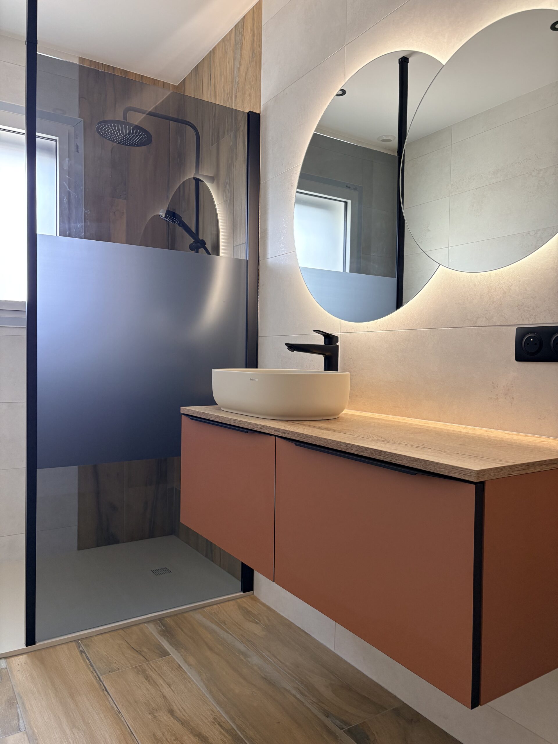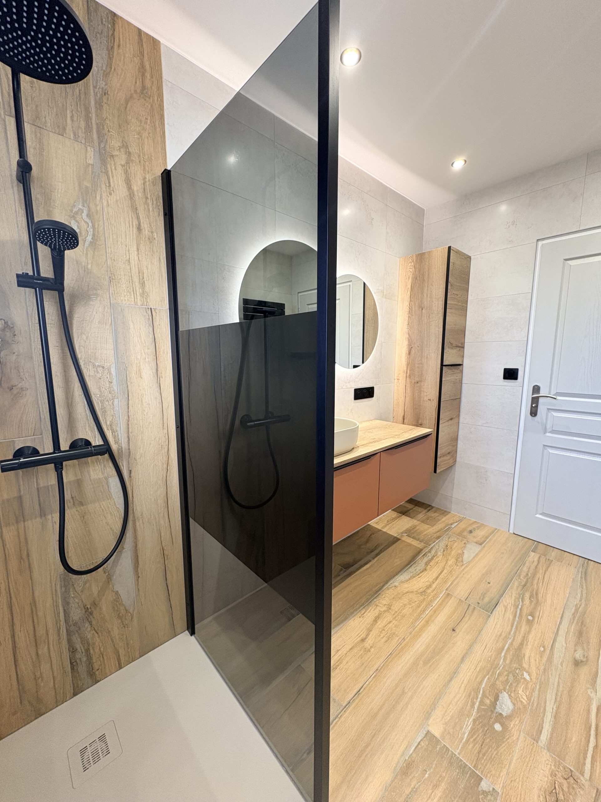 Cette douche à l’italienne associe un receveur Hidrobox et une paroi design Novellini, références reconnues pour leur qualité et leur finition haut de gamme. La robinetterie noire Hansgrohe apporte une touche contemporaine tout en garantissant performance et fiabilité au quotidien. Le meuble suspendu aux teintes chaleureuses, accompagné de son miroir rétro-éclairé, crée un espace lumineux, fonctionnel et résolument moderne, idéal pour transformer votre salle de bain en véritable espace de bien-être.